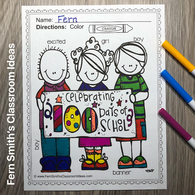 Print all the pages and bind together for your students to have an independent 100th Day of School Coloring Pages with Differentiated Seasonal Vocabulary coloring books at their desk for any downtime.